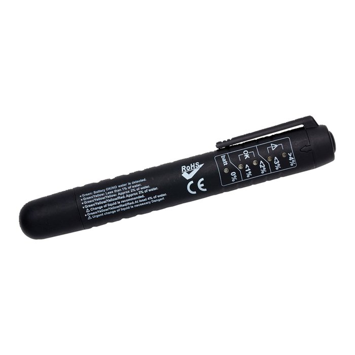 Dient zur digitalen Prüfung der Bremsflüssigkeitsqualität. Für den professionellen Einsatz in Werkstätten konzipiert. Mit insgesamt 5 LEDs. Eine LED zeigt die Batteriequalität an. LED 1 und 2 zeigen weniger als 1 bis zu 2 Prozent Wasser (akzeptabel) an, LED 3 und 4 zeigen 3 oder 4 Prozent (inakzeptabel) Wasser in der Bremsflüssigkeit an. Einfach zu bedienen.