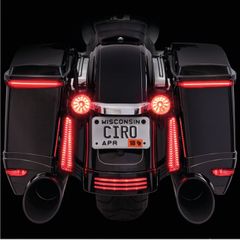 The Ciro LED Bag Blade covers are one of the cleanest ways to add additional lighting to the rear of the bike. The lightweight, low-profile housing sits directly under the lid of the bag and integrates seamlessly into the rear of the bike. The Ciro Bag Blades are characterized by bright brake, rear and sequential blinker lights in yellow or red. The plugs must be modified for use on bikes such as International HDI models that do not have a marker light function.