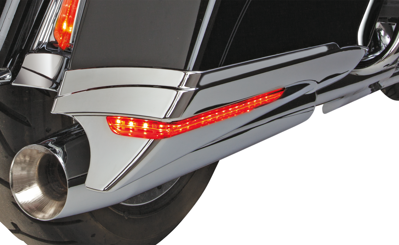 Give your bike that smooth, lower, custom look with Ciro Saddlebag Extensions. Built by real riders, these saddlebag extensions were designed for standard Harley hard bags with flat bottoms. Lean angle clearance remains unchanged so you don't need to make any compromises in the corners. Manufactured from the same ABS material as your original equipment bags; these extensions are tough and built to last. Increased visibility and style with red LED lights on the sides and back to make sure you're seen from all angles. Works as running-, turn-, and brake lights on US Domestic models, and turn & tail light on HDI International Export models. The run/turn/brake function on HDI International Export models can be activated with the separately available Elektronik Trick Box fmc-749510. Unfortunately, the lighting is not EU compliant.