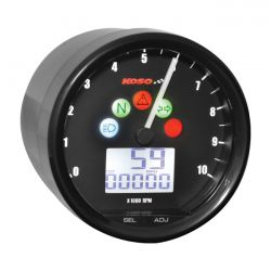 Black with black face. This ABE/KBA approved 64mm diameter 'multimeter' instrument has it all: Speedometer, tachometer, trip meters, indicator lights, fuel gauge, shift light, clock and more. A great solution for an all-in-one instrument for bikes where basic is King. Stepper motor driven to better resist vibrations. - 12V DC - Speedometer: 0-360 kmh (0-225 mph) switchable - Display impuls: <0.5 seconds - Odometer display range: 0-99999 km (miles) - Trip meter A/B display range: 0-999.9 km (miles) - Reset automatically after 0-999.9 km (miles) - Trip meter unit: 0.1 km (miles) - Tire circumference setting unit: 1 mm - Sensor points: 6 - Tachometer display range: 0-10.000 rpm - Shift light adjustment range: 8.000-10.000 rpm - Adjustable per: 100 rpm - Warning (shift light) Light on (F-OFF) - Flash (F-ON) - RPM signal setting - Setting range: 0.5, 1-24 - RPM pulse range: Hi-Act (positive), Lo-Act (negative) - Indicator lights: Turn signal (green), Warning light (red), Neutral (green), High beam (blue), Shift light (red) - Fuel gauge display range: 6 levels (20% each) - Fuel gauge settings: 100 Ohm, 250 Ohm, 510 Ohm, 1200 Ohm, SW, User - Clock 24h - Backlight brightness: 1-5 levels (dark to light), each level is 20% - Temperature range: -10 - 60 ° C (14 140 ° F) - Standard JIS D 0203 S2 - Includes passive speed sensor: BF019005 - Dimensions approx: 68.3 bezel diameter x 64.6 built-in diameter x 54 mm built-in depth - Weight 127 gram - ABE/KBA approved - Complete with installation hardware kit, brackets and instructions Note: Check your local MCS dealer or the MCS sales department for exact type of approval and validity on bike model and years on the test report.