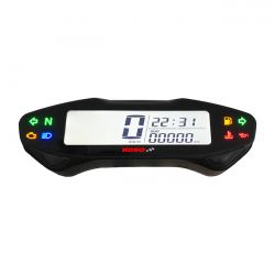 Koso, DB EX-03 multifunctional speedometer Black plastic housing. Does not include a tachometer. Comes with a speedometer, odometer, hour meter, clock, stop watch, voltmeter, workshop interval settings, records values as maximum speed, maximum voltage and average speed. Equipped with indicator lights for engine oil, low fuel level, water temperature, high beam, turn signals and an engine check light. - Speedometer: 0 to 360 km/h (0 to 225 mph) - Odometer: 0 to 99.999 km (miles) - Trip counter A and B: 0 to 9,999.9 km (miles), auto reset after 9999.9 km - Hour meter (total engine run time) to 99.999 hours - Operating hours counter A/B: 0 to 9999.9 hours, auto reset after 9999.9 hours - Clock: 00:00 to 23:59 - Volt meter: 8.0 to 18.0V DC - Stopwatch: 0:00:00 to 9:59:99 to 0.01 seconds - Workshop interval setting: 300 to 5000km. Manually reset - Average speed: 0 to 360 km/h (0 to 225 mph) - Max Speed: 0 to 360 km/h (0 to 225 mph) - Max Voltage: 8.0 to 18.0V DC - Instrument battery level: 4 levels - Operating temperature range: -10 °C to +60 °C - Dimensions: 120mm wide x 38.8 x 34.2mm - JIS D 0203 S2 rain test approved - Weight 70 gram - Indicator lights: Left turn signal & right turn signal (green), oil (red), water temperature (red), engine check light (amber), low fuel (amber), neutral (green), high beam (blue) - Dimensions 120mm wide x 38.8mm x 34.2mm - Weight 70 gram