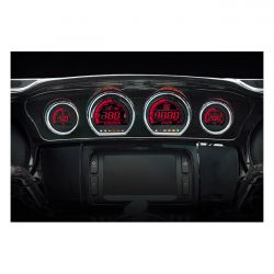 Plug & play replacement for the OEM instruments. Plug OEM connectors into instruments and install into the fairing. Ready! Dual display color option (red or blue) and 5 intensity levels for the digits and graphics in each individual instrument. Once the ignition is off, all instruments are completely black for a great custom look. This kit includes a 4" speedometer, a 4" tachometer with gear indicator, a 2" oil temperature gauge, and a 2" fuel gauge. - 12V DC - Speedometer: 0 to 299 km/h (0 to 199 mph) - Display refresh rate: <0.5 seconds - Overspeed warning setting: 30 to 299 km/h (19 to 199 MPH). When the set value is reached, the warning lamp lights up - Maximum speed record: 0 to 299 km/h (mph) - Odometer display range: 0 to 999.999 km/h (mph) - Tripmeter A/B: 0 to 9,999.9 km (miles) - Oil change interval: 8,000 to 900km / miles adjustable. Counts down as the number of km / miles increase. From 0 km/miles the warning light flashes and the device counts down to maximum minus 999 km/miles. Manual reset - Gear indicator: N, 1, 2, 3, 4, 5, 6 - Tachometer: 0 to 9,990 RPM. Displays per 10 RPM - Shift light: : 2,000~8,000 RPM, per 100 RPM adjustable. Light turns on when set RPM is reached - Engine temperature: 40 to 300 °C / 40 to 572 °F -Fuel Level Gauge Display Range: H-D Standard / Custom - Fuel level H-D Standard: LCD flashes as warning when fuel level resistance is greater than 211 ohms, and turns off when resistance is less than 187 ohms - Fuel level custom: LCD flashes as warning when fuel level resistance is below 20%, and turns off when fuel level is higher than 30% - Fuel tank volume setting: Off / 1.0 to 9.9 US gallons - Average fuel consumption: Off / liters per 100 km / km per liter / Miles per gallon (US specs) / Miles per gallon (UK specs) - Fuel 'remaining distance': 0 to 9.999 km (6.249 miles) - Fuel 'remaining distance': LCD shows 'LO RNG' and flashes as a warning when remaining range is less than 16 km (10 miles) - Clock: 12h / 24h - Oil Temperature Gauge: 0 to 400°F (32 to 248°C), displays per 1 F° (1 °C) - Maximum oil temperature (storage): 0 to 400°F (32 to 248°C) - Volt meter range: 8 to 18V - Brightness digits: 5 levels - Color digits / graphics: 2 colors, red or blue - Works from -10°C to 60°C - JIS D 0203 (S2) standard specified - Weight speedometer & tachometer: 286 gram - Weight oil temp.: 81 gram - Weight fuel gauge: 81 gram - Indicator lights: Turn signal (Green), Photometric sensing (No color), Oil (Red), Check Engine Light (Yellow), Cruise Control (Orange/Green), Immobilizer (Red), Water Temperature (Red), Warning Light (Yellow), High Beam (Blue), Fog Light (Yellow), ABS (Red)