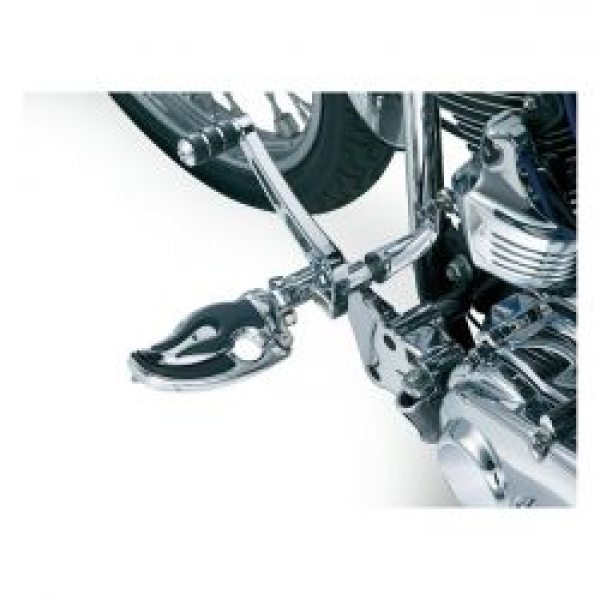 Chrome plated. The flip-out 'Switchblade' design can be used as a heel rest for improved long haul comfort. With anti-slip rubber inserts. Note: See 541463 for the style matching shift peg. Note: Incl. traditional H-D male mount adapter, for below mentioned applications. Model specific tapered foot peg adapters are found in the adapter overview and must be purchased separately when required.
