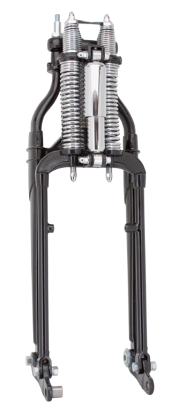 These are perfect copies of the stock Springer style front forks as found in FLSTS, FLSTSC, and FLSTSB Softail 1997-2004 with a 16" front wheel and left side fitted brake caliper, or FXSTS and FXSTSB Softail 1988-2006 with a 21" front wheel and right side fitted brake caliper. Another noticeable difference is that, like stock, the forks for FL Softail have an 8° rake, whereas FX Softail forks have a rake of 3°. Forks come complete and ready to install. Caliper mounting brackets and wheel axles are not included.