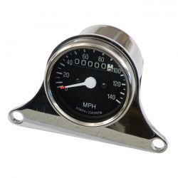 Mini speedometer with MPH face and 2:1 drive ratio. Chrome with a black face plate. Includes bracket that mounts between the handlebar top clamp and risers. Complete with mounting hardware and wiring instructions. Dimensions: Height/depth- 5.3 cm O.D.- 6.1 cm Bracket mount holes (center to center)- 11 cm