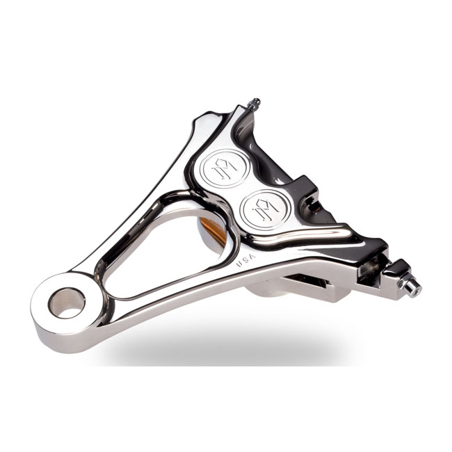Polished CNC machined billet aluminum Rear One-piece caliper bracket (caliper with integrated bracket) for unsurpassed stiffnes - Designed for stock 11.5" brake rotors - Direct replacement for Softails - ABS and Non-ABS compatible - 4-piston differential bore - Proudly machined with the PM icon logo - Designed to slow down... fast, without flexing. Performance Machine has been in the forefront of brake caliper design, ever since 1982. Each caliper and bracket is precision CNC machined from billet aluminum to a high-end performance product that combines lightweight, flex resistance and durability with a hard to beat styling. Available in various coatings to suit your taste.