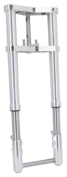 Italian suspension specialists Maselli developed the ultimate front suspension for American V-Twin motorcycles and produces these exclusively for Zodiac. Improved handling and damping characteristics are the benefits of these precision made units, which feature chrome-moly fork tubes, machined aluminum alloy sliders, hard anodized damper rods and smooth clear or black anodized top tubes and wheel axle clamps. The triple trees are machined from a block of billet aluminum with a mirror shine polished finish, and then eventually black anodized. Forks feature integrated caliper brackets left and right for use with 2000-up Harley style calipers (except radial type) designed for use with 11 1/2" (292mm) discs.